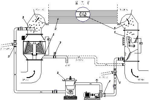 1、凝汽器 2、二次濾網 3、裝球器 4、膠球泵循環泵 5、收球網 6、清洗膠球 7、分匯器 8、噴球器 9、電動排污門