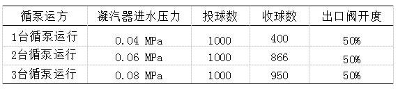 通過(guò)表2可看出,隨著循泵運(yùn)行臺(tái)數(shù)增加,凝汽器的進(jìn)口壓力升高,進(jìn)、出口差壓增大,收球率大大提高。
