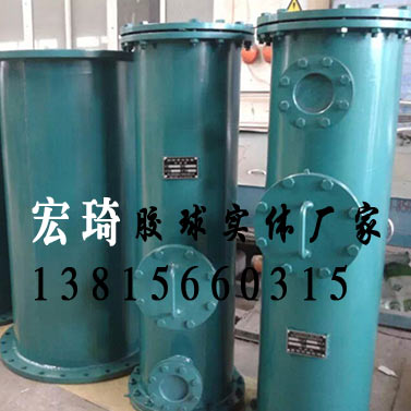 分匯器是一個(gè)三通(管)閥。通過(guò)其中導(dǎo)向板的切換可使膠球進(jìn)入需要清洗的一側(cè)凝汽器中。也可作為收球網(wǎng)膠球引出管的匯合和接球管的分流三通管使用。