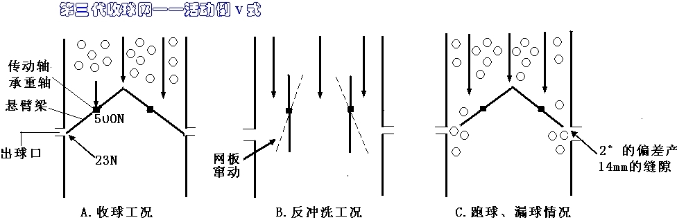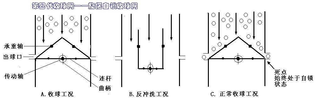收球網的各工況都由網板底端的旋擺機構來實現,傳動軸與承重軸分開,收球工況時網板呈穩定的三角形,徹底解決了懸臂梁問題,受力非常合理,密合力大。