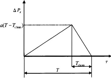 通過(guò)測(cè)取機(jī)組清潔率隨時(shí)間變化的曲線(xiàn),就可以得到由于臟污使汽輪機(jī)排汽壓力Pc隨時(shí)間的變化關(guān)系。即:p,-=fM, ⑴其中,岳為汽輪機(jī)排汽壓力,Pa。由汽輪機(jī)功率Pe隨排汽壓力變化關(guān)系曲線(xiàn),得:P哉(公),⑵結(jié)合式(1)和式(2),可以得到由于臟污所引起的汽輪機(jī)功率隨時(shí)間的變化式:ARHS),⑶其中,△四為臟污所引起的汽輪機(jī)功率的變化值,kWo當(dāng)清洗系統(tǒng)投入運(yùn)行時(shí),污垢的清除也是逐漸進(jìn)行的,隨著清洗過(guò)程的繼續(xù),由臟污所造成的損失逐漸減小,直至清洗時(shí)間K噸后,臟污所引起的損失達(dá)到零,在清洗過(guò)程中汽輪機(jī)功率隨時(shí)間的變化式如下。AF"),⑷其中,Ape為在清洗過(guò)程中汽輪機(jī)功率的變化值,kW0為簡(jiǎn)化計(jì)算,在不長(zhǎng)的時(shí)間間隔內(nèi),可以將功率損失曲線(xiàn)近似作直線(xiàn)處理,如圖1所示。