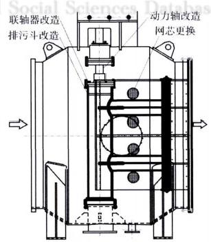 (1)排污斗改造。拆除原有的排污斗上部與動力軸連接的聯軸器及其短軸,將原短軸連接位置的排污斗上端加長約200mm,并在加長段上部焊接改造后的聯軸器代替,增強其受剪切應力。