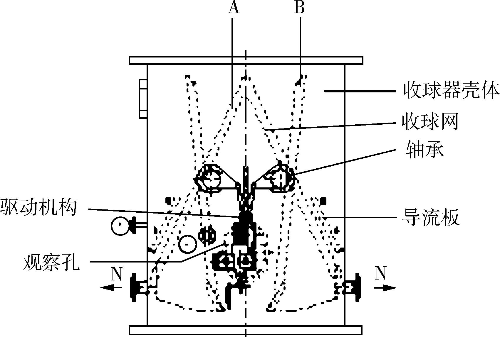 水冷式冷凝器膠球在線自動清洗裝置(見圖1)工作原理為,通過清洗泵將膠球送入列管式冷凝器管程中,循環水壓力大約在0暢4MPa,清洗膠球依靠循環水壓力隨著循環水在冷凝器管內流動,通過膠球與冷凝器管壁間的相互摩擦來清洗掉冷凝器管壁上的沉積物。在冷凝器出口端利用膠球收球器回收膠球,膠球的回收是通過收集裝置的驅動機構來實現的(見圖2),利用驅動機構帶動循環水管道內部收球網形狀的改變,形成正“八”字或者倒“八”字形,以達到收集膠球的目的。然后,再將回收的膠球送至清洗泵,由清洗泵將膠球再次送至循環水入口處,這樣就形成一個清洗循環。我公司采用特殊的清洗泵來實現膠球在線清洗,由于循環過程是自動的、毋需停車,時間間隔短,沉積物在形成初期就被擦掉,使管壁永保潔凈,始終保持冷凝器的換熱效率處于佳狀態,克服由于污垢的產生而引起冷凝器換熱效率的下降,從而降低蒸汽消耗,提高汽輪機的工作效率。