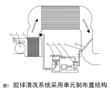 電廠#1、#2機組凝汽器膠球清洗裝置系統采用凝汽器清洗裝置,該膠球清洗裝置主要由兩臺125JQ-15型膠球泵,兩臺EW/800II型二次濾網、SF-1800收球網和ZQ-24裝球室組成。本膠球清冼系統采用單元制布置,這種布置方式可對凝汽器兩側同時清洗。1、排污閥2、清洗蝶閥3、二次濾網4、裝球室5、球閥6、膠球泵7、收球網8、收球網板操作機構。