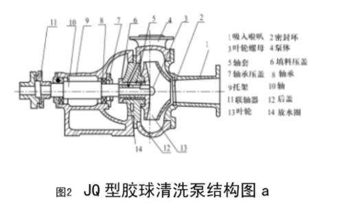 2.1.1.1JQ型膠球輸送泵主要零件有泵體、泵蓋、軸承室(或托架)、葉輪、軸等,這些零件除軸用優質碳素鋼制成外,其余用普通鑄鐵制成。泵蓋與吸入管鑄為一體,呈水平方向,出水口根據需要可旋90°180°270°泵與電機用牙嵌式聯軸器直接連接,從傳動方向看時,泵軸為順時針方向旋轉。密封環為鑄鐵制成,防止水泵中高壓水漏回進水部位,磨損后可用備件更換。