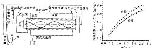 進行了銅管內安裝冷凝器自動膠球清洗裝置前后的傳熱系數(shù)對比試驗,試驗系統(tǒng)如圖2所示。用水泵抽出水池中的冷卻水,經過轉子流量計測出流量后,進入冷凝銅管帶動管內的螺旋冷凝器自動膠球清洗裝置旋轉;冷卻水的進出口溫度由精密溫度計測出;銅管外加熱蒸汽由40kW的蒸汽發(fā)生器供給。改變冷卻水的流速,測出冷凝銅管內安裝冷凝器自動膠球清洗裝置前后兩種工況下的傳熱系數(shù)。對比試驗的結果如圖3曲線所示。